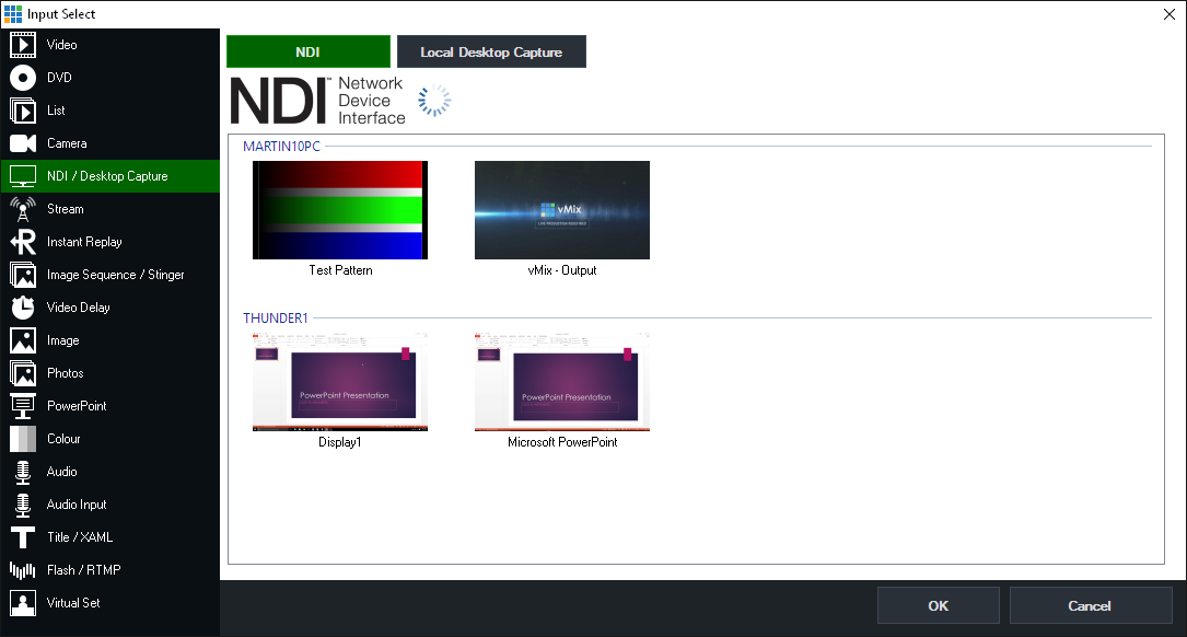 In the screenshot above, Microsoft PowerPoint is running on a laptop called "THUNDER1" and can be added to vMix simply by double clicking it from the list.