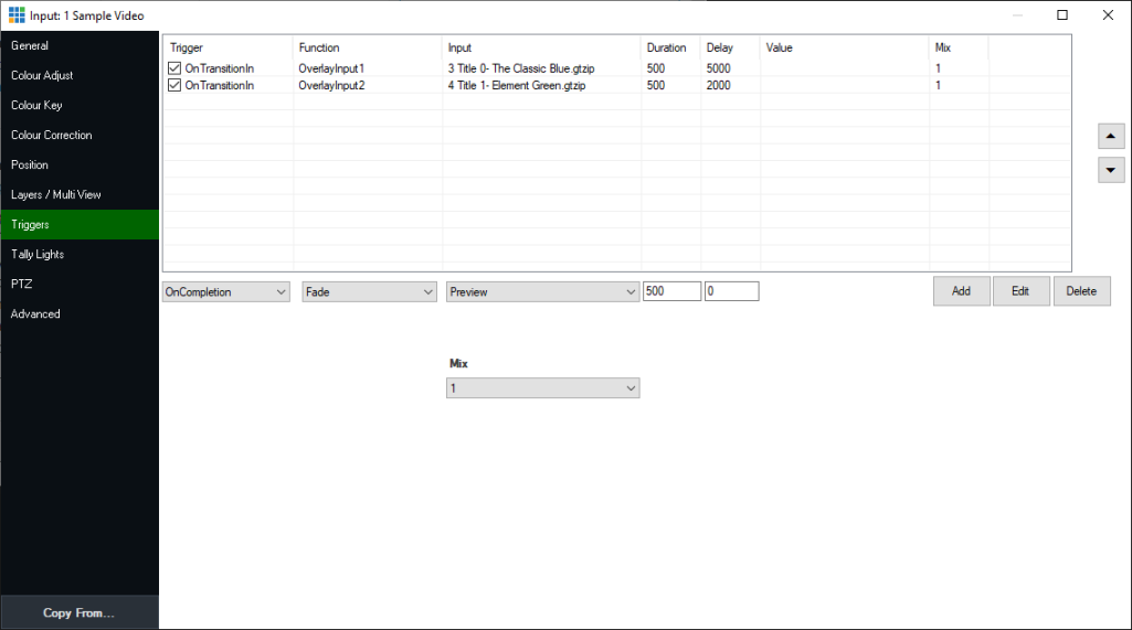 Triggers that use the same triggering name (such as OnTransitionIn) will run one after the other in the order that they are listed. In the example below, the OverlayInput1 function will be triggered 5 seconds after the ‘Input 1: Sample Video’ has transitioned to the main screen, and then an additional 2 seconds after this, the OverlayInput2 function will be triggered.