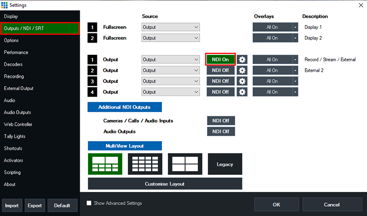 Next to Output 1, tick the NDI button so it is green and says NDI On. Then Press OK.