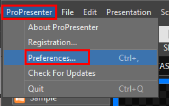 Open ProPresenter than select the ProPresenter menu up the top left and choose Preferences.