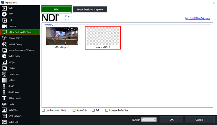 Next, go to your vMix computer and open up vMix. Select the Add Input menu button at the bottom left. Then choose the NDI/Desktop Capture tab. Then select the NDI option up the top.
