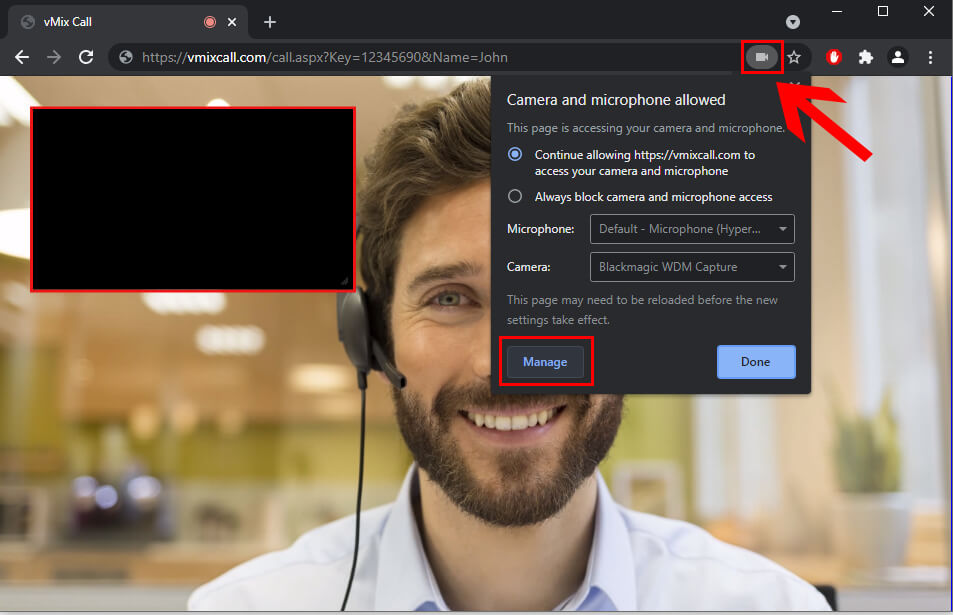 STEP 1. After logging in to the vMix Call, select the Camera icon at the top right corner of the address bar. Then click Manage.